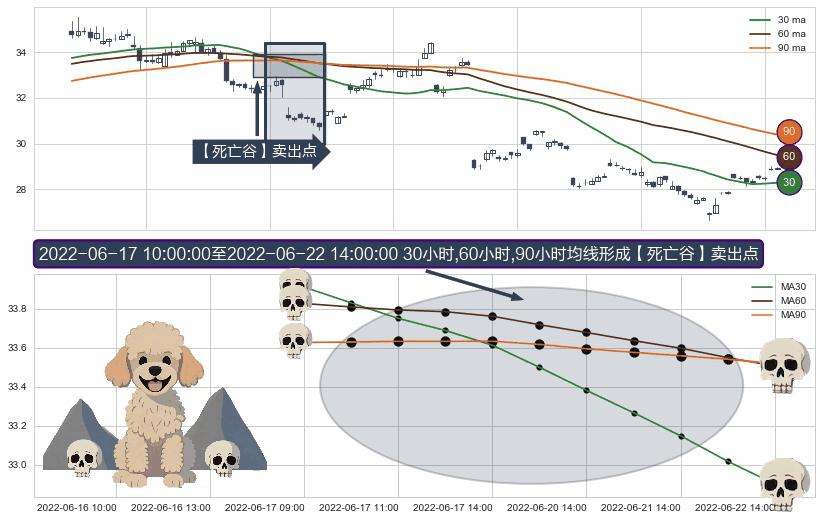 ⚀ 2022-06-17 11:00:00-小时至2022-06-22 14:00:00-小时显现 30小时-60小时-90小时均线 【死亡谷】卖出点 看空信号,后市看跌,卖出