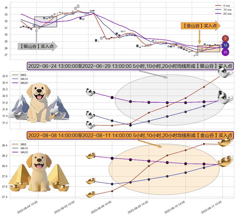 ⚀ 2022-08-09 13:00:00-小时至2022-08-11 14:00:00-小时显现 5小时-10小时-20小时均线 【金山谷】买入点 其再次确认了买入信号,可靠性更强,买入