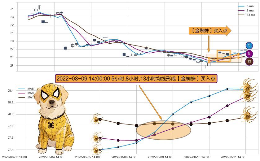 ⚀ 2022-08-09 14:00:00小时显现 5小时-8小时-13小时均线 【金蜘蛛】买入点 看多信号,后市看涨,买入