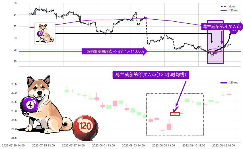 ⚀ 2022-08-08 13:00:00-小时显现 葛兰威尔均线 120小时均线 第④买入点 下降趋势均值回复的短线反弹信号,后市看涨,买进信号
