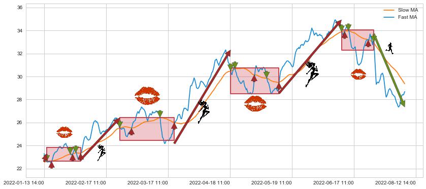 06-13 11:00至07-08 14:00 慢线与快线多次接触,存在上下穿越,有缠绕