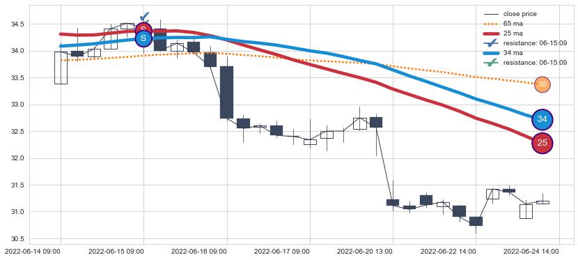 ⚃ 2022-06-15 10:00:00小时开盘价格在三条均线上收大阴线,收盘全跌破均线,收盘股价下跌-1.25%