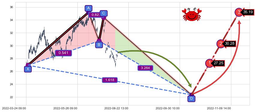 ➢ 距离预测D点位置有足够的下跌空间, 与看涨【螃蟹】形态相反,实际方向【看跌】