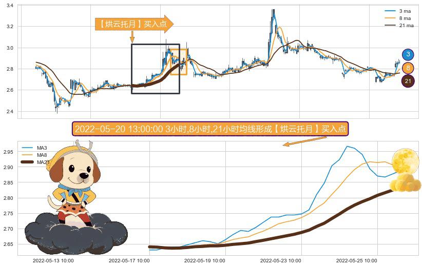 形态多维评估: ⚀ 2022-05-17 10:00:00小时-2022-05-25 14:00:00小时显现 3小时-8小时-21小时均线 【烘云托月】买入点 看多信号,后市看涨,买入