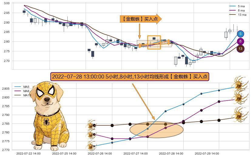 形态多维评估: ⚀ 2022-07-28 13:00:00小时显现 5小时-8小时-13小时均线 【金蜘蛛】买入点 看多信号,后市看涨,买入