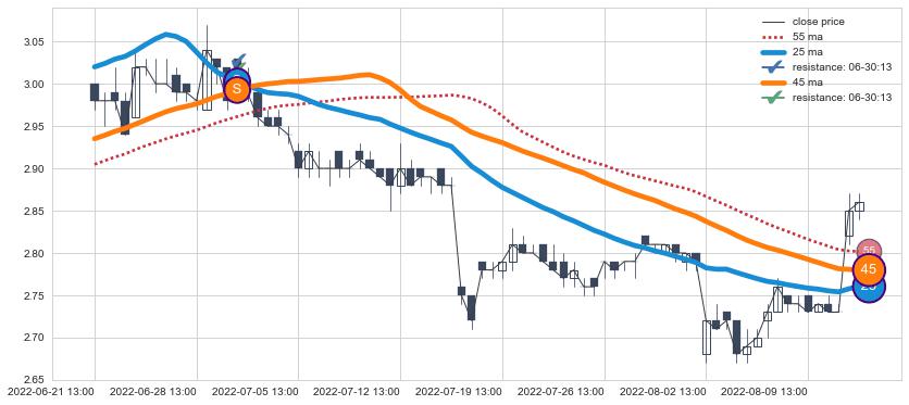 下跌趋势06-21 13:00-08-11 14:00,均线25, 45确认关键阻力1处