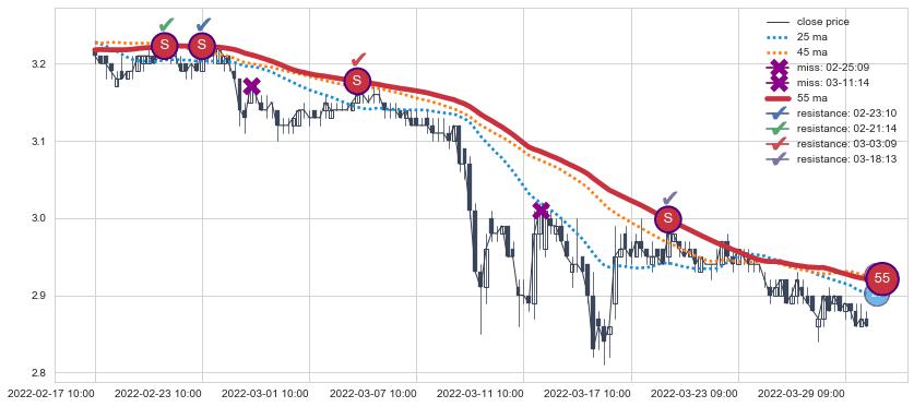 下跌趋势02-17 10:00-03-29 14:00,均线55确认关键阻力4处