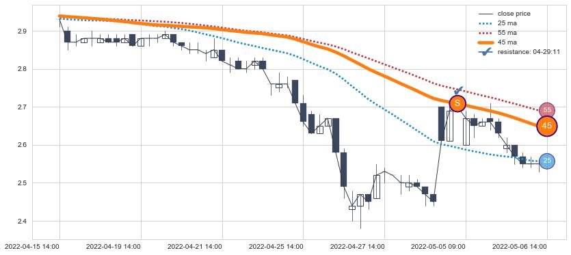 下跌趋势04-15 14:00-05-06 14:00,均线45确认关键阻力1处
