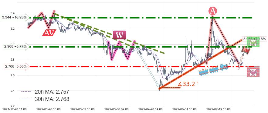 ♘ 阻力价格位2.968,可信任强度87.81%,距离最后交易2022-08-12 14:00形成的收盘价格2.860相差 +3.77%