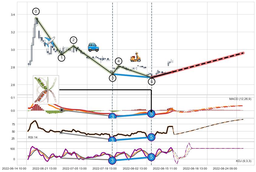 ➣ 1,3,5驱动浪MACD, RSI, KDJ走势都出现【常规背离】反转信号增强