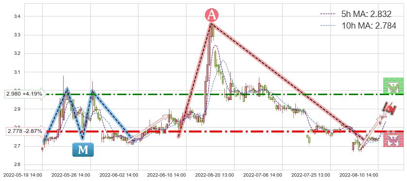 ♘ 阻力价格位2.980,可信任强度66.61%,距离最后交易2022-08-12 14:00形成的收盘价格2.860相差 +4.19%
