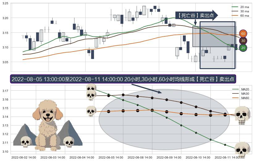 ⚀ 2022-08-05 14:00:00-小时至2022-08-11 14:00:00-小时显现 20小时-30小时-60小时均线 【死亡谷】卖出点 看空信号,后市看跌,卖出