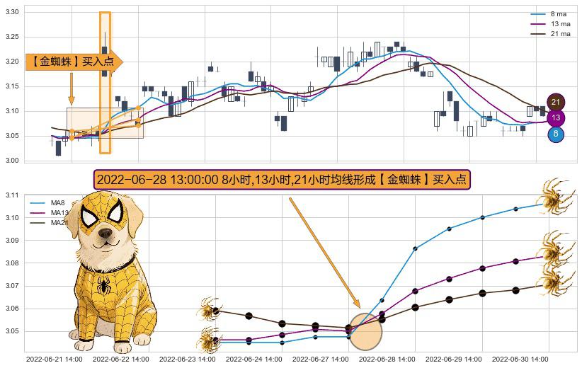 ⚀ 2022-06-28 13:00:00小时显现 8小时-13小时-21小时均线 【金蜘蛛】买入点 看多信号,后市看涨,买入