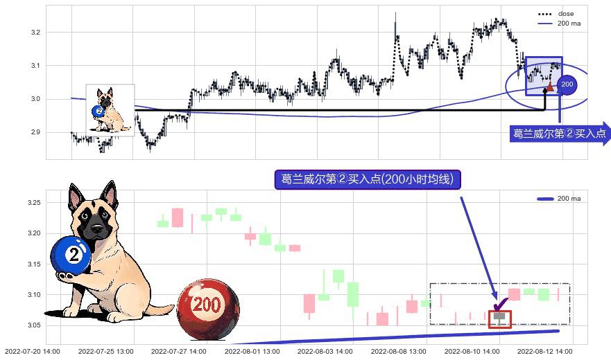 ⚀ 2022-08-10 14:00:00-小时显现 葛兰威尔均线 200小时均线 第②买入点 上升趋势的中继信号,后市看涨,买进信号