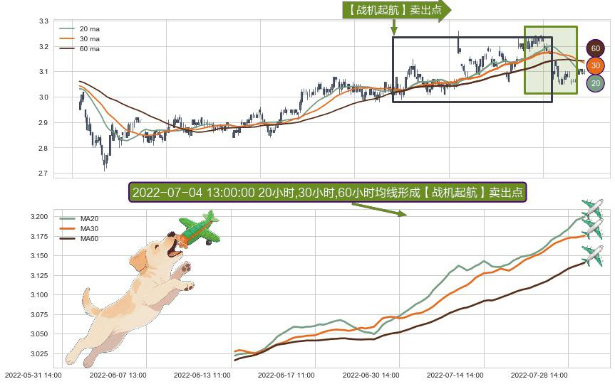 ⚀ 2022-06-13 13:00:00小时-2022-08-01 14:00:00小时显现 20小时-30小时-60小时均线 【战机起航】卖出点 看空信号,后市看跌,卖出