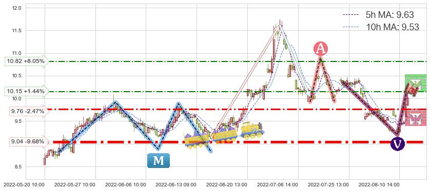 ♘ 阻力价格位10.82,可信任强度51.65%,距离最后交易2022-08-12 14:00形成的收盘价格10.01相差 +8.05%