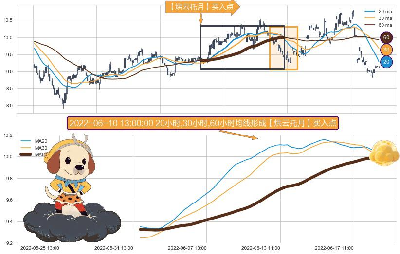 形态多维评估: ⚀ 2022-06-01 09:00:00小时-2022-06-22 13:00:00小时显现 20小时-30小时-60小时均线 【烘云托月】买入点 看多信号,后市看涨,买入