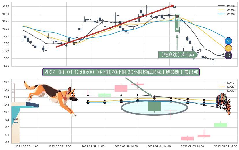 形态多维评估: ⚀ 2022-08-01 13:00:00小时显现 10小时-20小时-30小时均线 【绝命跳】卖出点 看空信号,后市看跌,卖出