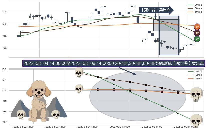 形态多维评估: ⚀ 2022-08-05 13:00:00-小时至2022-08-09 14:00:00-小时显现 20小时-30小时-60小时均线 【死亡谷】卖出点 看空信号,后市看跌,卖出