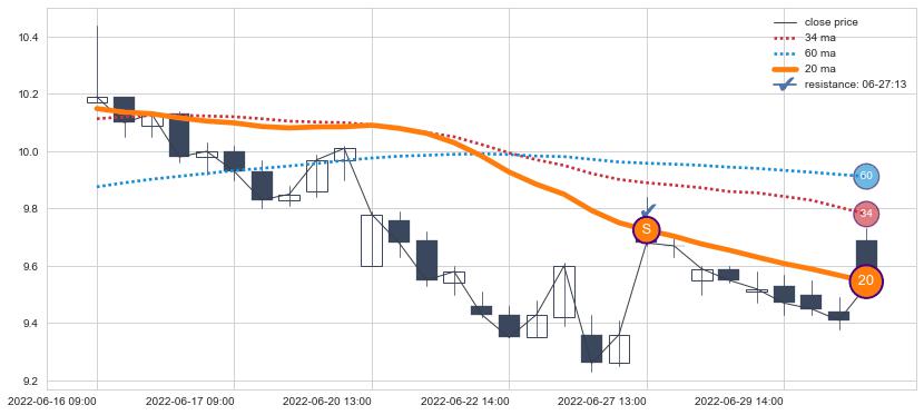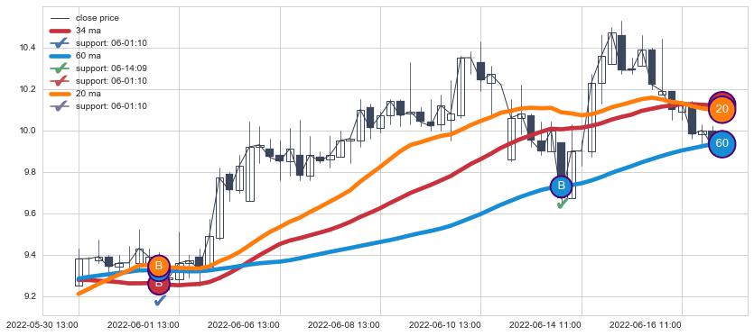 上涨趋势05-30 13:00-06-17 09:00,均线34, 60, 20确认关键支撑2处