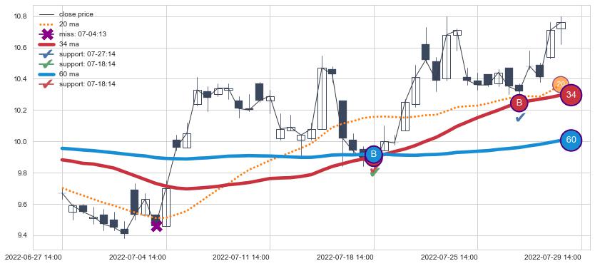 上涨趋势06-27 14:00-07-29 14:00,均线34, 60确认关键支撑2处