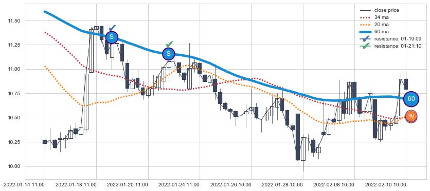 下跌趋势01-14 11:00-02-10 10:00,均线60确认关键阻力2处