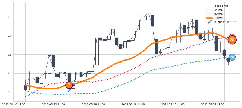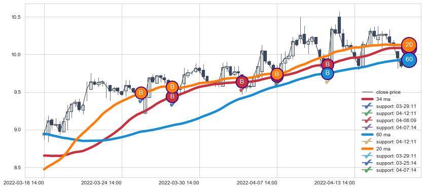 上涨趋势03-18 14:00-04-18 10:00,均线34, 60, 20确认关键支撑5处
