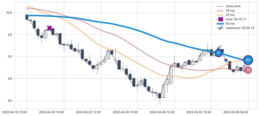 下跌趋势04-18 10:00-05-09 09:00,均线60确认关键阻力1处