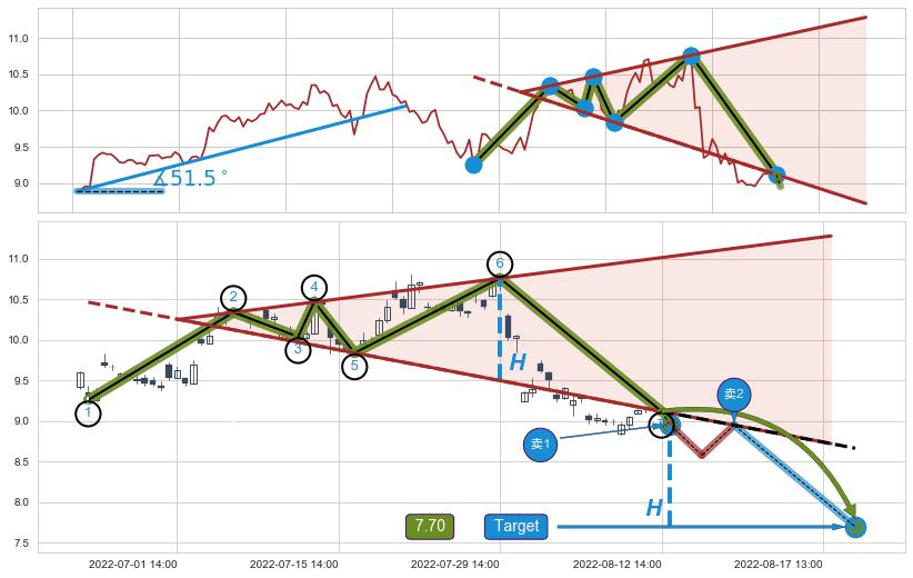 从2022-07-29 14:00至2022-08-12 14:00,共包含21个小时,阶段股价下跌-15.89%,阶段股价变动位移路程比: 1 : 1.9,2022-08-02 13:00向↘︎形成缺口,跳空下跌-6.96%˚