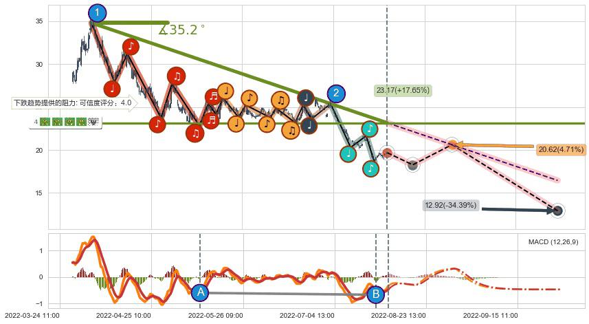从2022-04-06 11:00至2022-08-12 13:00,共包含324个小时,阶段股价下跌-52.02%,阶段股价变动位移路程比: 1 : 7,下跌趋势角度: 35.2