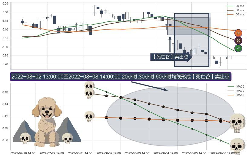 ⚀ 2022-08-02 14:00:00-小时至2022-08-08 14:00:00-小时显现 20小时-30小时-60小时均线 【死亡谷】卖出点 看空信号,后市看跌,卖出