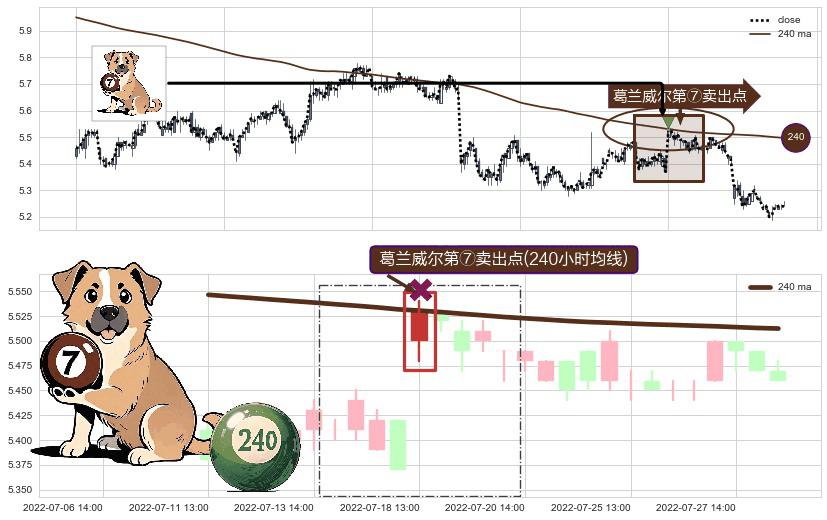 ⚀ 2022-07-18 13:00:00-小时显现 葛兰威尔均线 240小时均线 第⑦卖出点 下降趋势的中继信号,后市看跌,卖出信号