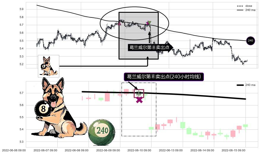 ⚀ 2022-06-09 13:00:00-小时显现 葛兰威尔均线 240小时均线 第⑧卖出点 下降趋势的中继信号,后市看跌,卖出信号