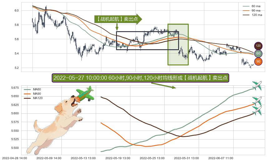 ⚀ 2022-05-16 10:00:00小时-2022-06-09 14:00:00小时显现 60小时-90小时-120小时均线 【战机起航】卖出点 看空信号,后市看跌,卖出