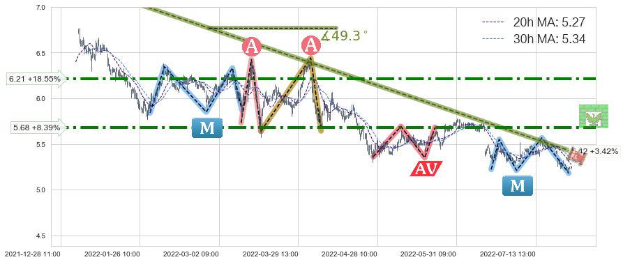 ➣ 预测:2022-08-31 12:00,【试探阻力】稳定目前下跌趋势的前提下,预测价格:5.16