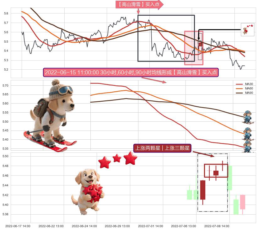 | 6 🅚:【高山滑雪】买入点 ➕ 📡:谐波鲨鱼猜想c点下沉击穿越过b点后报复性拉升上涨(均值回复) ☞ 看多信号 ⇥ 【均线】交织【图形】⇥ 综合量化分数: 57 | > |