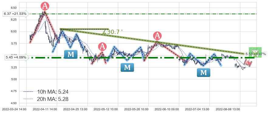 ♘ 阻力价格位5.45,可信任强度92.98%,距离最后交易2022-08-12 14:00形成的收盘价格5.24相差 +4.09%