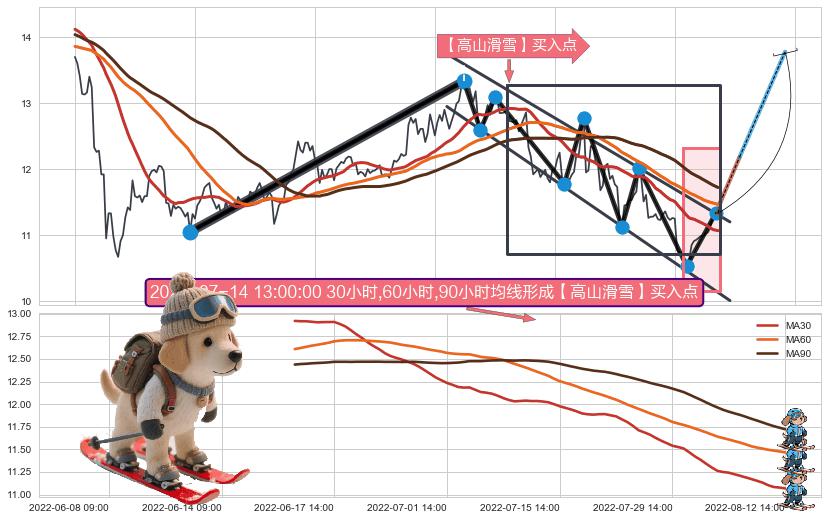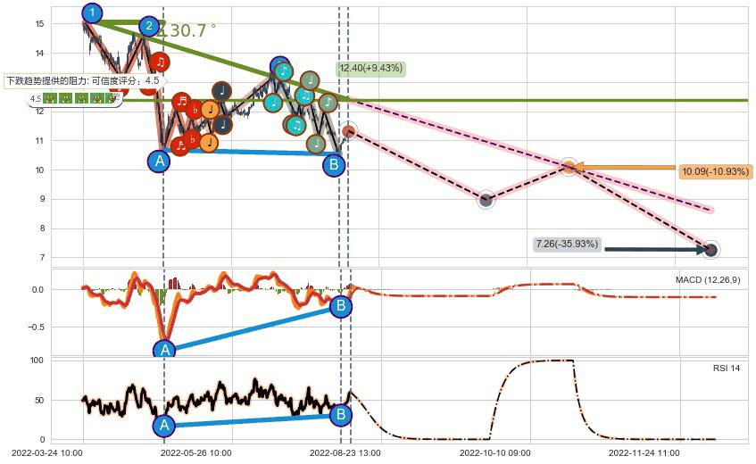 ♘ 在最后的下跌阶段2022-03-25 09:00至2022-08-11 14:00,存在 持续未破位的阻力位 ,阻力价格12.40,可信任强度88.44%,其距离最后价格11.33相差 +9.43%