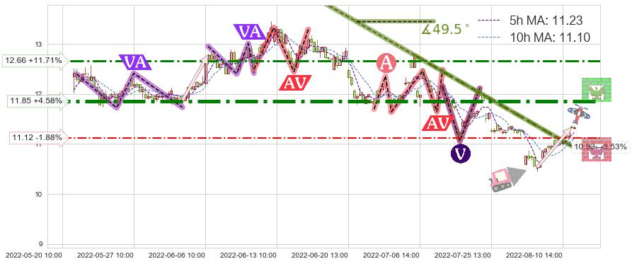 ♘ 阻力价格位11.85,可信任强度93.99%,距离最后交易2022-08-12 14:00形成的收盘价格11.33相差 +4.58%