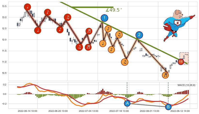 从2022-06-10 14:00至2022-08-11 14:00,共包含105个小时,阶段股价下跌-15.37%,阶段股价变动位移路程比: 1 : 7,下跌趋势角度: 49.5,2022-07-06 13:00向↘︎形成缺口,跳空下跌-6.50%˚