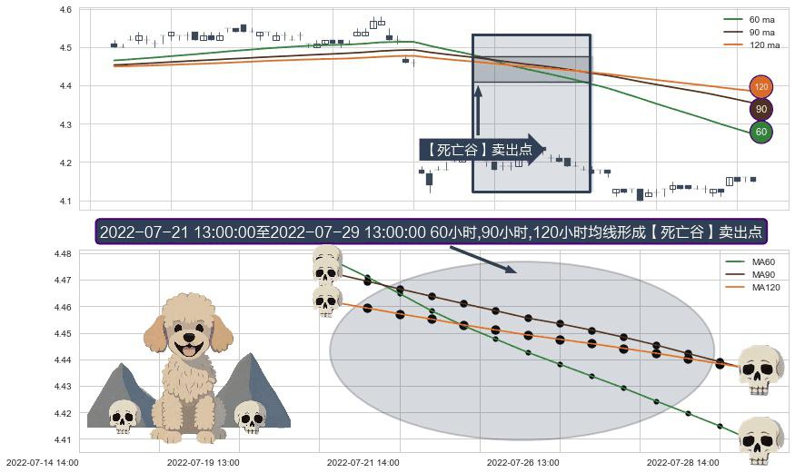 形态多维评估: ⚀ 2022-07-21 14:00:00-小时至2022-07-29 13:00:00-小时显现 60小时-90小时-120小时均线 【死亡谷】卖出点 看空信号,后市看跌,卖出