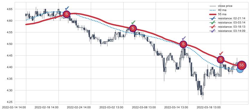 下跌趋势02-14 14:00-03-22 13:00,均线55确认关键阻力4处