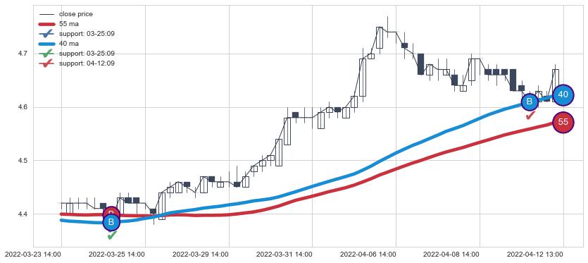 上涨趋势03-23 14:00-04-12 13:00,均线40, 55确认关键支撑2处