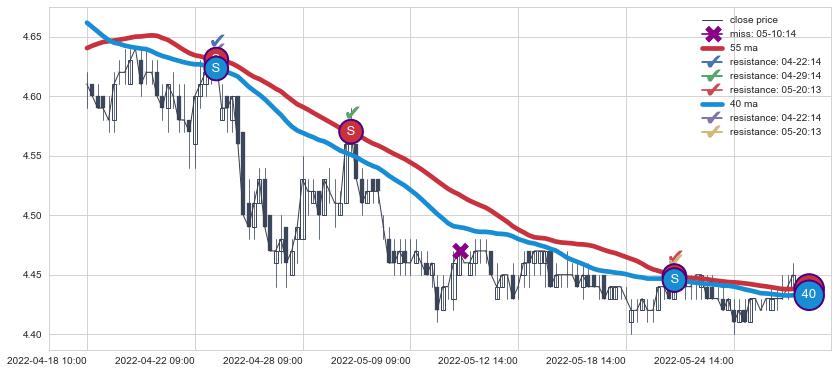 下跌趋势04-18 10:00-05-27 09:00,均线40, 55确认关键阻力3处