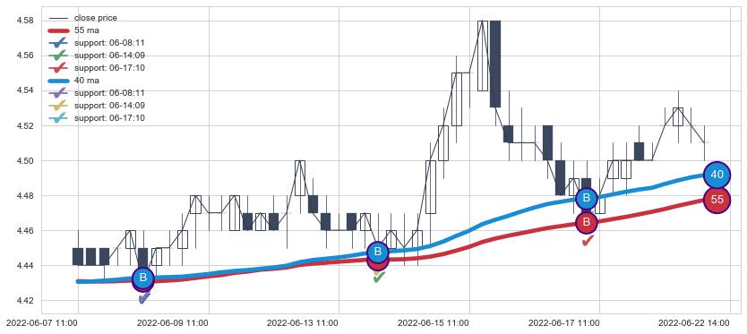 上涨趋势06-07 11:00-06-22 14:00,均线40, 55确认关键支撑3处