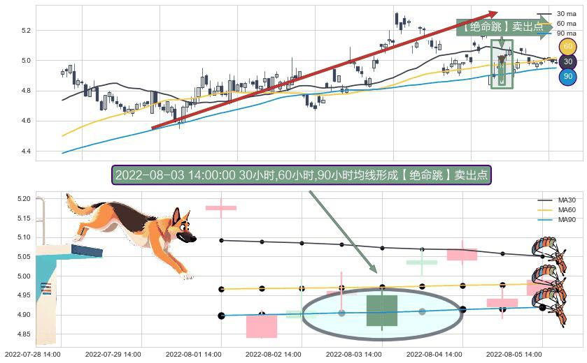 ⚀ 2022-08-03 14:00:00小时显现 30小时-60小时-90小时均线 【绝命跳】卖出点 看空信号,后市看跌,卖出
