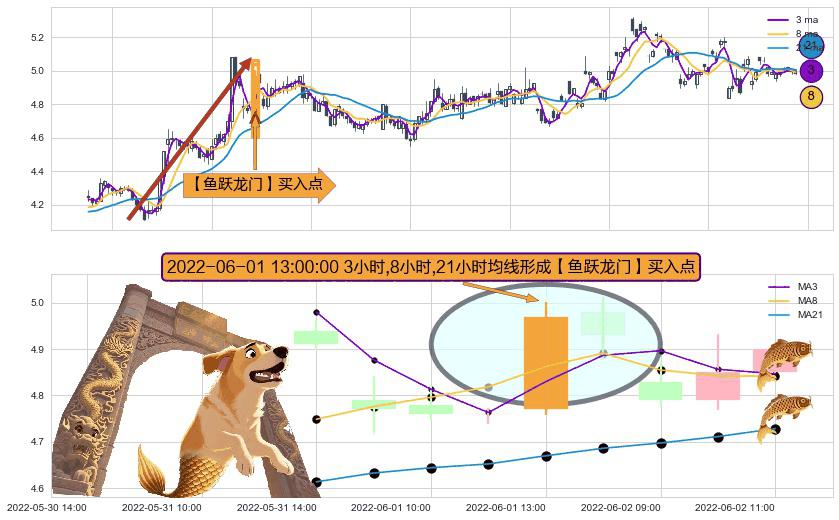 ⚀ 2022-06-01 13:00:00小时显现 3小时-8小时-21小时均线 【鱼跃龙门】买入点 看多信号,后市看涨,买入