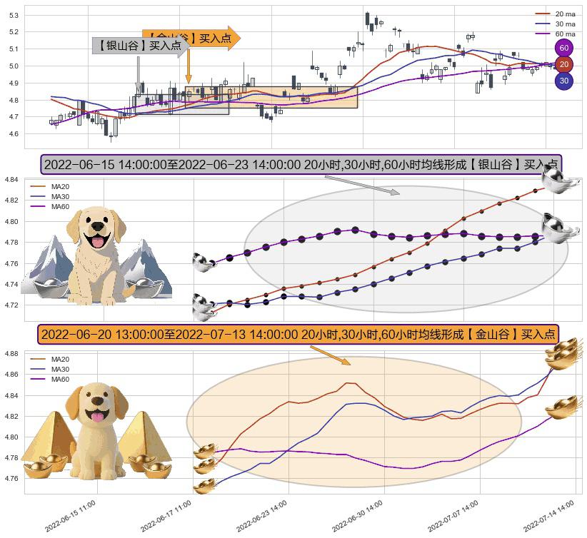 ⚀ 2022-06-20 14:00:00-小时至2022-07-13 14:00:00-小时显现 20小时-30小时-60小时均线 【金山谷】买入点 其再次确认了买入信号,可靠性更强,买入