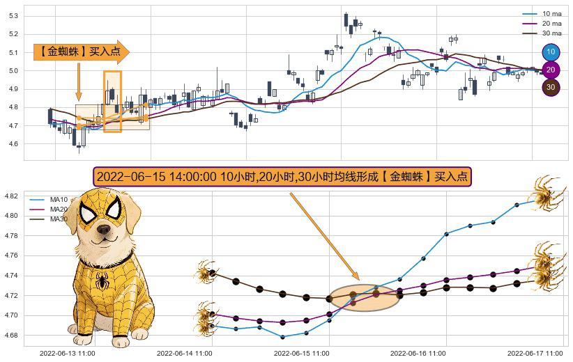 ⚀ 2022-06-15 14:00:00小时显现 10小时-20小时-30小时均线 【金蜘蛛】买入点 看多信号,后市看涨,买入