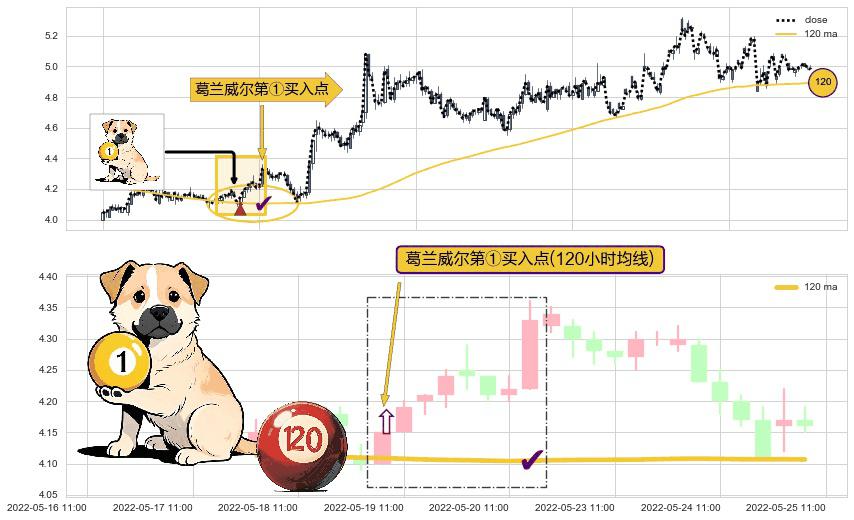 ⚀ 2022-05-19 10:00:00-小时显现 葛兰威尔均线 120小时均线 第买①入点 走势反转见底信号,后市看涨,买进信号